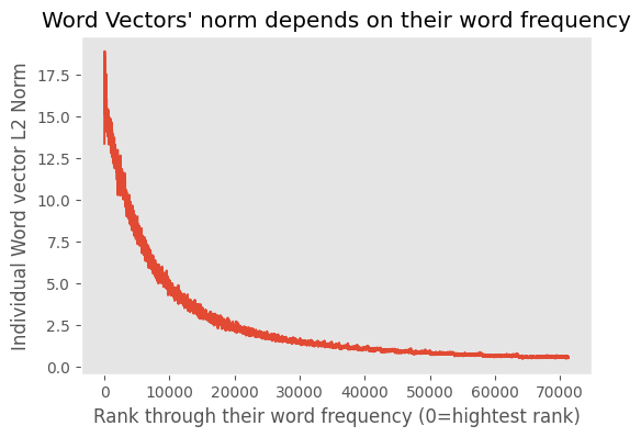 실험에 있어 한 가지 옵션을 추가하였는데, 아래 이미지와 같이 개별 word vector의 크기는 학습된 단어의 frequency에 비례한다. 즉, word frequency 정보가 vector에 녹아 있기 때문에, 실험에 있어 이를 통제하기 위해 normalized vector와 raw vector를 모두 확인하였다. 미리 언급하자면, 해당 실험의 한계로는, 이미지 데이터의 경우 인식하기 상대적으로 쉬우며 무엇보다 이미지 당 라벨이 할당되어 있지만, 단어의 경우에는 휴리스틱하게 적용할 수밖에 없다는 부분이 있다.