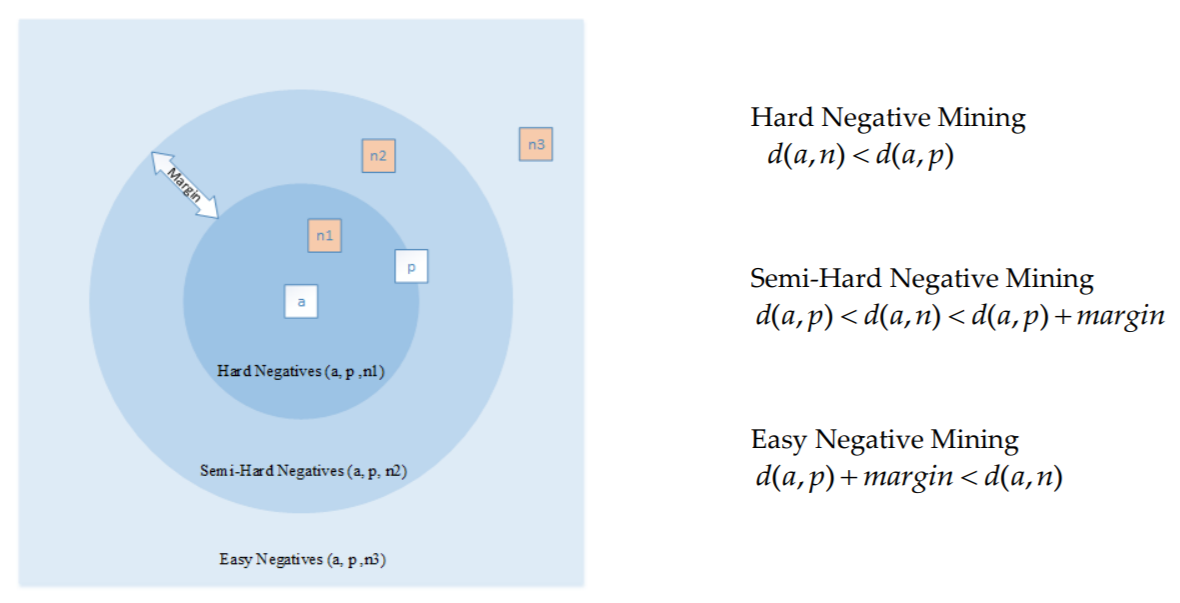 triplet mining 에서 많이 사용되는 sampling 기법이 semi-hard sampling 으로 위의 수식을 보면 알 수 있듯, positive sample 보다 anchor 와 멀리 떨어져 있어, 아예 틀린 건 아니지만, positive margin 반경 아래에 있어, 좀 더 분명한 분별이 필요한 경우이다. 이 경우, false-positive 의 경우를 줄이면서, 안정적/효과적으로 학습할 수 있게 된다.