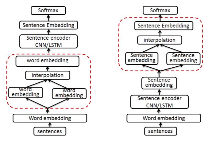 NLP에서 mix-up 을 제시한 논문에 따르면, 위와 같이 두 가지로 나뉘어지는데, 각각 wordMixup 과 senMixup 이라고 부른다. mix-up 을 어느 단계에서 진행하냐의 차이가 존재하고 embedding 을 mix 하는 컨셉은 동일하다. 두 모델 모두 벤치마크 모델을 상회하는 Accuracy 를 보여주었지만, 개인적으로 wordMixup 이 잘되는 건 좀 신기해보인다.