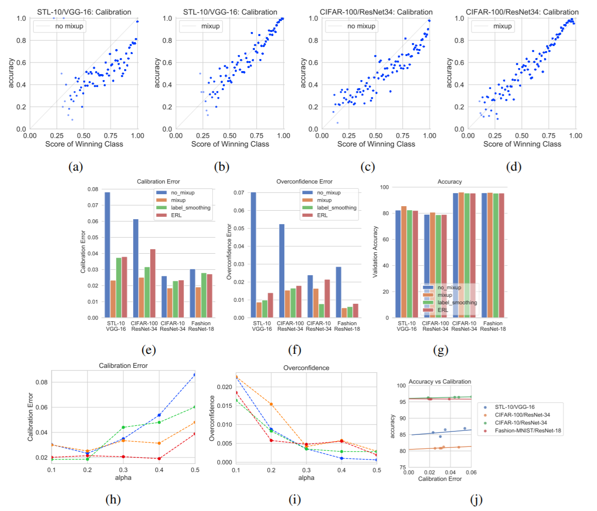 위의 이미지를 보면, mixup 과 함께 비교군으로 "epsilon smoothing label" 기법과, "entropy-regularized loss(ERL)" 기법을 가지고 실험을 한 결과이다. 논문에서, Expected Calibration Error (ECE) 와 Overconfidence Error (OE) 에 대한 measure 를 제시하였고, 이를 시각화하였고, 해당 measure 들은 모두, 결국 모델의 confidence (sampling 된 input x 에 대한 예측값(softmax)의 max value들의 평균)과 모델의 accuracy 간의 관계를 보는 것이다.