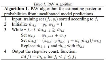 보다 쉬운 이해를 위해 참고 논문에 첨부된 이미지를 보면, 제일 윗 행이 input 이 되는 predicted probability이며, 순서대로 sigmoid 와 PAV algo 에 따른 isotonic regression에 따른 fitting 결과이다.