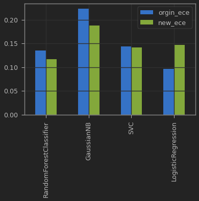 logistic regression 을 제외한 나머지 방법론에 있어서 크고 작은 ECE 감소를 확인할 수 있었다. 참고로 SVC 의 경우 원래 logit 을 반환하는 모델이지만, probability=True 옵션을 주면, 내부적으로 sigmoid calibration 을 진행한다고 한다. sigmoid scaling 을 통한 방법론을 Platt 이 제시해서, 본문에는 Platt scaling이라고 명시되어 있다. 이에 따라 (이미 같은 방법론으로 calibration 을 했음), SVC 의 경우 성능 변화가 거의 보이지 않는다.