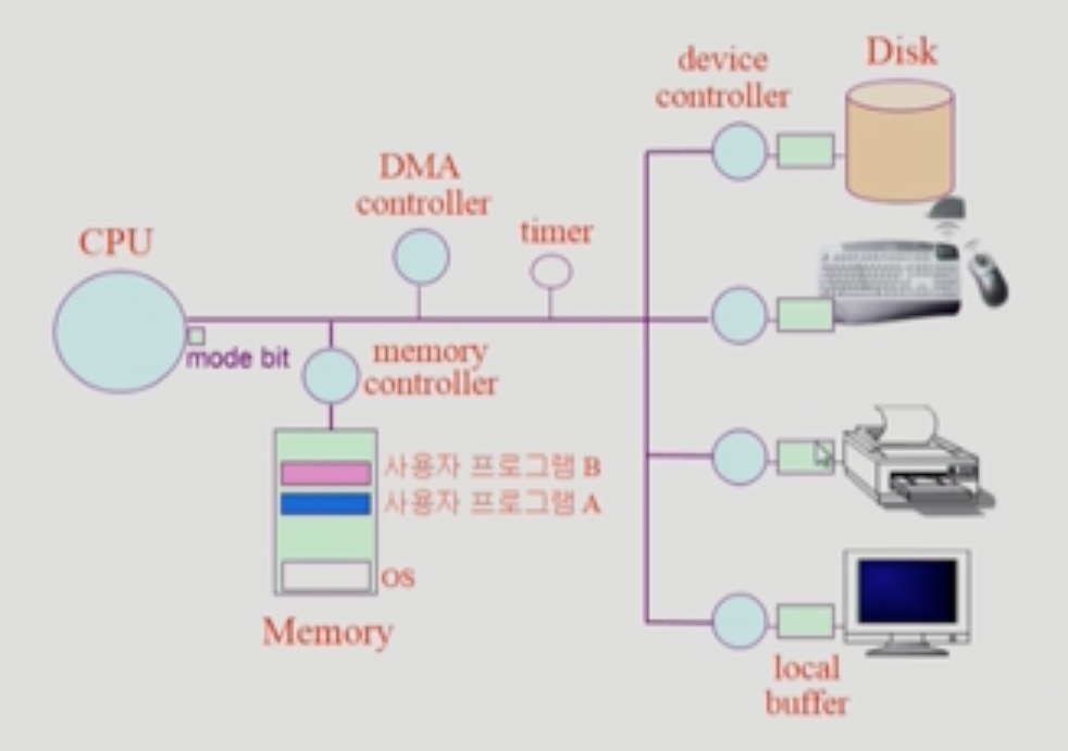 - interrupt line : cpu에서 instruction을 실행하고 있다가, keyboard나 disk 에서 뭘 읽어서 어떤 instruction을 실행해야 하는 상태가 될 수 있음. 그럴 때는 device controller 에게 일을 시킨다. 그동안에 cpu 는 또 다른 일을 다시 하고 있다. (메모리랑)