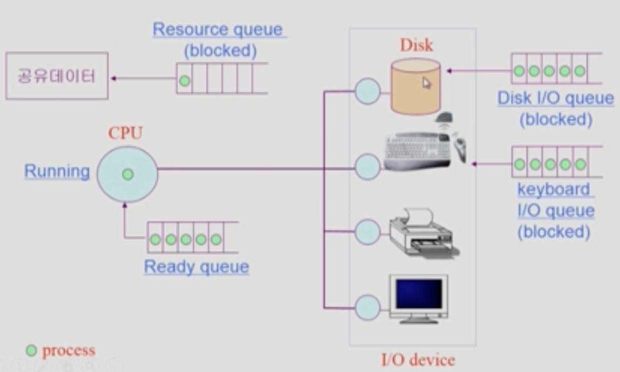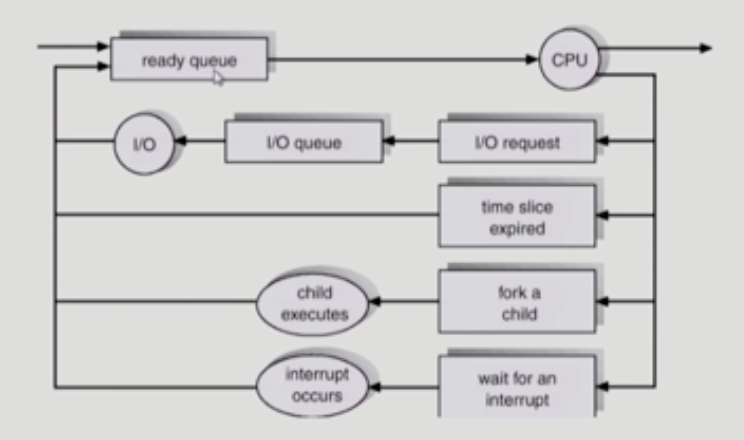 프로그램이 실행되면 ready queue 로 감. 그러다가 자기 차례가 되면 cpu 로 간다. 그러다가 시간이 되거나, interrupt 가 되거나, i/o requests 가 되거나 하면 다시 ready queue 로 간다. 또한 자식 프로세스를 만들 수도 있음, 그런 경우에도 ready queue 로 간다.
