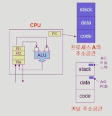 - 각 process 가 자기 자신의 코드를 실행할 때는 함수 호출이 이뤄지면 stack 에 호출한다. process가 실행하다가 자신이 할 수 없는 일을 os 에게 요청하게 되면 (system call) program counter 가 커널 주소 공간을 가리키게 된다. 이 때, kernel 주소 공간은 다양한 process들이 공유하기 때문에 kernel 주소 공간의 kernel stack 는 process 별로 별도의 stack 을 가지게 된다.