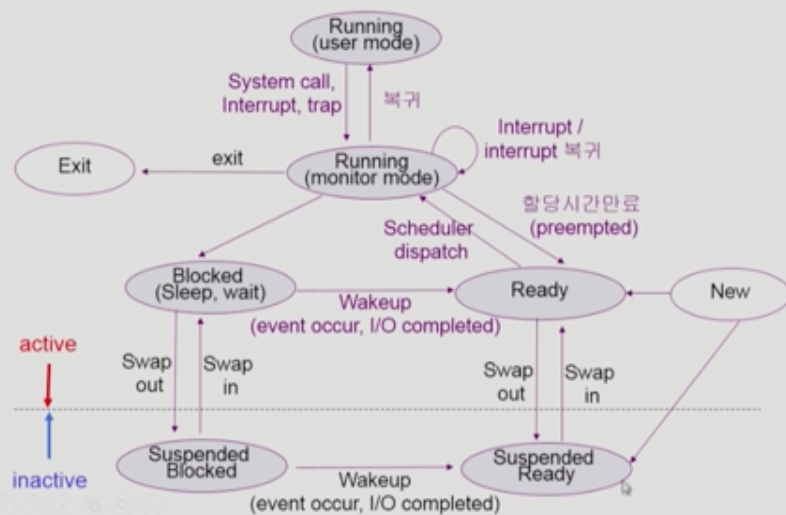 - 외부적인 이유로 process의 수행이 정지된 상태 (외부 : mid-term scheduler)