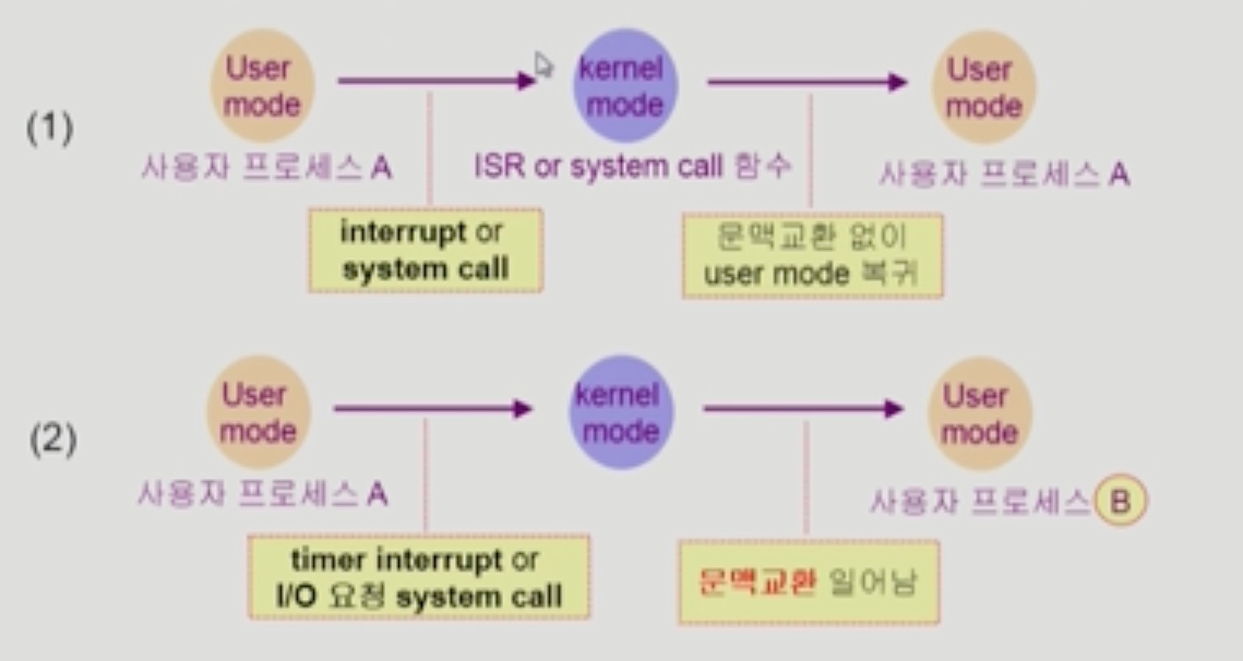 user process가 바뀌어야 그것을 context switch 라고 하는거다. system call이나 context switch 발생할 때 항상 context switch 가 발생하는 것은 아님. 아래의 1,2 번 모두 pcb에 process context 를 저장해야 하지만, 2의 경우가 부담이 훨씬 크다고 한다 (cache memory flush 등이 발생한다고 함)