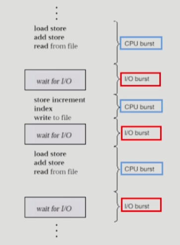 cpu 를 사용하는 path는 cpu 를 쓰는 단계와 (CPU burst) io 를 쓰는 단계가 (I/O burst) 번갈아가면서 이뤄져있음