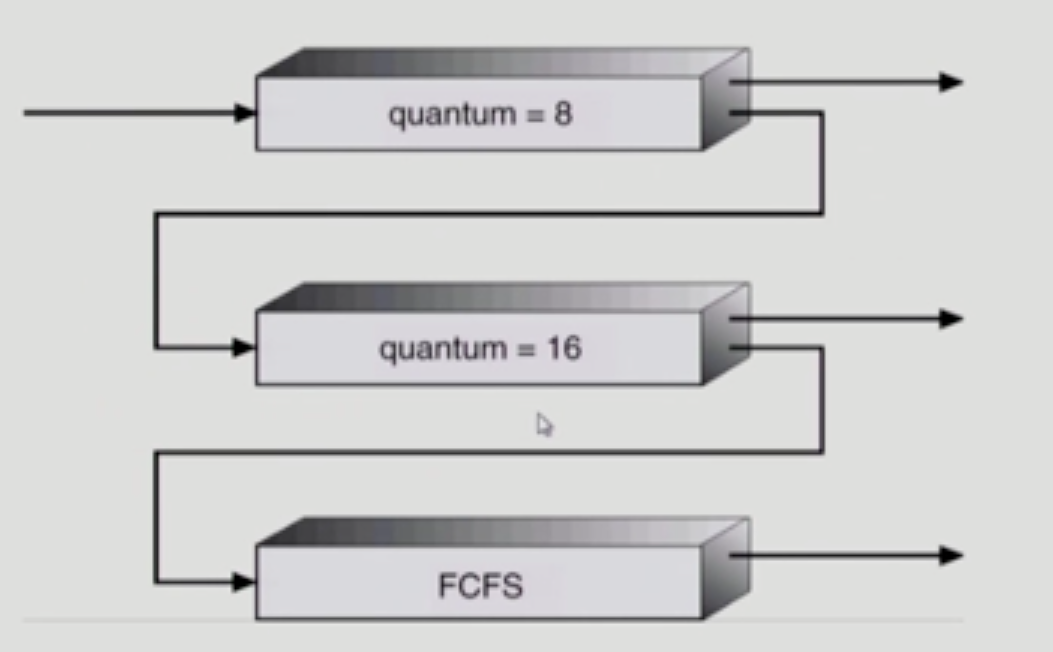 - 아래 이미지에서 보면 알 수 있듯, 우선 순위가 높은 queue 일 수록 time quantum 이 작다. 즉, cpu burst time 이 짧아야만 high priority queue 에서 process를 종료할 수 있다.