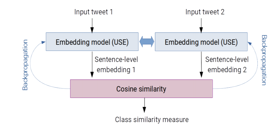 이에 따라, 저자가 제시하는 문제는 "해당 문장이 어떤 라벨에 속하는 지가 아닌, 두 문장이 같은 라벨에 속하는 문장인지를 구별하게 만들자" 이다. 우선 모델은 siamese network 로 model parameter를 sharing 하는 쌍둥이 embedding을 가지고 있는 모델이다. 방법은 매우 간단한데, 모델에 넣기 전, 데이터 셋을 pair 로 준비한다. 이때 pair 가 같은 클래스를 가지는 데이터 pair 과 다른 클래스를 가지는 pair가 되어야 하는데, 랜덤으로 세팅하면 되기 때문에, combination을 사용하거나, 랜덤 함수를 사용해 무작위 세팅을 하면 된다. batch-size가 N일 때, N은 같은 라벨 pair S와 다른 라벨 pair D의 합이 될 것이고, 같은 라벨 pair 문장 벡터 간 cosine-difference 에 다른 문장 벡터 간 cosine-difference를 빼주면 해당 모델의 loss 가 나온다. 모델이 잘 학습될 수록 아래 식 우변의 앞의 term이 작아지고, 뒤의 term 이 작아지기 때문에, loss 가 줄어들게 된다.