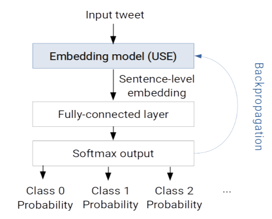 아래의 모델 아키텍쳐는 우리가 흔히 알고 있는, classification model의 형태이다. sentence embedding 모델 위해 full-connected layer를 얹어 output dimension을 우리가 타겟팅하는 라벨의 갯수 차원으로 맞춰주고, softmax regression하면서, pre-trained 된 sentence embedding까지 학습을 시키게 되면, 라벨 정보를 담고 있는 문장 임베딩을 가지게 된다.