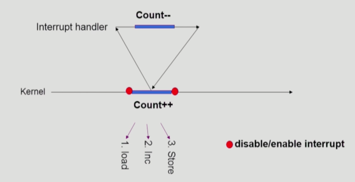 - kernel mode 코드 실행 중에는 interrupt 를 받지 않는 식으로 대응
