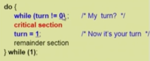 $process_i$가 자기 차례가 되면, turn 이 $i$ 가 됨. $process_i$ 의 turn 을 바꿔주는 것은 $process_j (i !=j)$ 가 해준다.