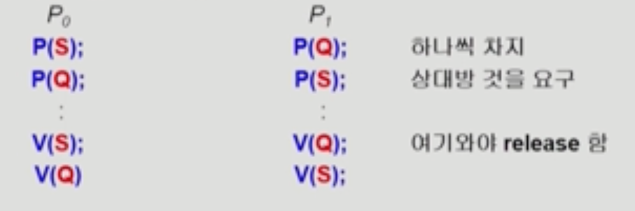 - 어떤 프로그램이 S와 Q에 대한 리소스를 둘 다 필요로 할 때, 하나의 프로세스가 하나를 물고 잠들고 나머지 하나가 하나를 물고 잠들면서 서로의 프로세스가 각 자원을 놓기를 기다리게 되면, 영원이 두 프로세스는 종료되지 않는다.