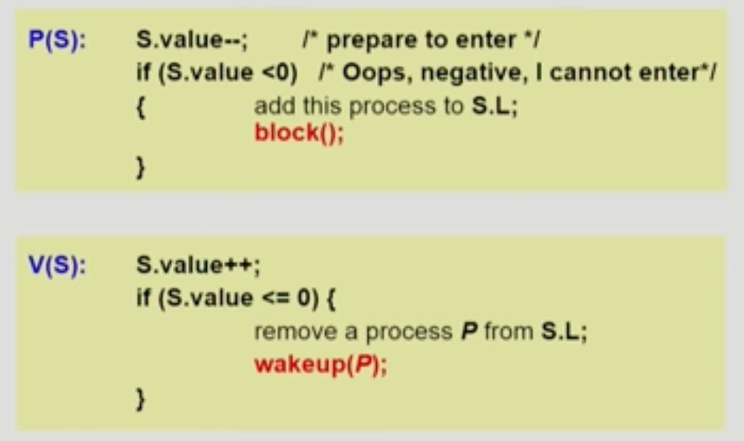 - V(S) : 자원을 하나씩 반납하는 것, lock 을 푼다