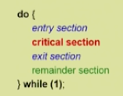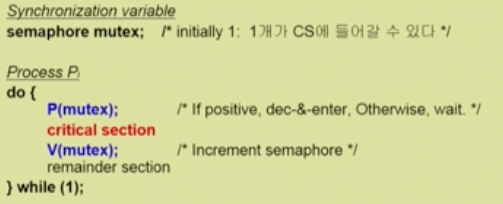 - bounded waiting : 프로세스가 critical section 에 들어가려고 요청한 후부터 그 요청이 허용될 때까지 다른 프로세스들이 critical secgion에 들어가는 횟수에 한계가 있어야 함 -> 기다리는 것도 정도가 있어야 한다는 뜻