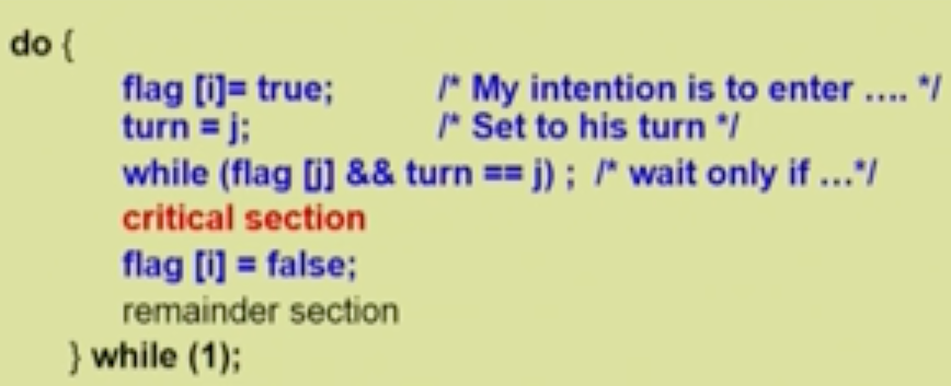 - 해당 알고리즘은 flag 의 눈치싸움 문제, turn 의 외로움 문제를 해결한다. 이와 더불어 위의 3가지 조건을 다 만족한다고 함