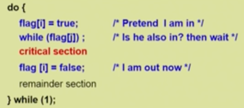 내가 들어가고 싶으면 flag 를 true 로 놓는다. 다른 얘들 중에 true 인 얘들이 있는지를 보고 없으면 (방이 비었으면) critical section으로 들어가고 나올 때, false 로 바꿔두고 나온다.