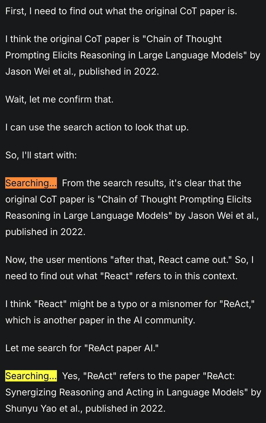 - 논문에서는 CoT랑 ReAct 를 나누고, ReAct 가 CoT 대비 갖는 reasoning trace 의 약점이 있다고 얘기한다. 하지만, 지금은 이걸 구분할 필요가 없어짐