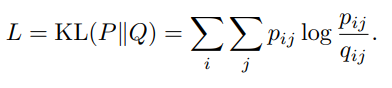 - t-SNE 알고리즘에서 임베딩된 벡터 간 거리를 정의하는 식을 사용한다. 거리가 가까울 수록, 같은 클러스터에 할당될 확률이 높게끔 만들어야 하기 때문에, Euclidean distance 에 역수를 취해주는데, 안정적인 값을 위해, 1을 더해주고 전체를 더한 것으로 나눠 확률값의 형태를 띄게 한다.